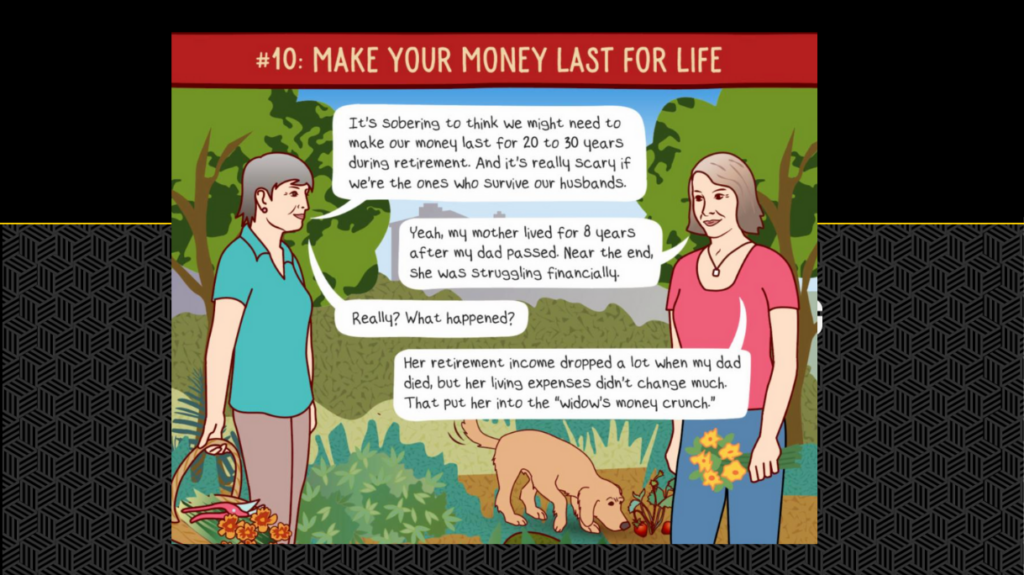 “This gave me an opportunity to address this common misconception in a story format,” says Vernon. “And, people remember pictures rather than me telling them, just ‘hey, you ought to delay taking Social Security.’ Seeing someone who’s relatable to them in a picture format will help them remember that better.”