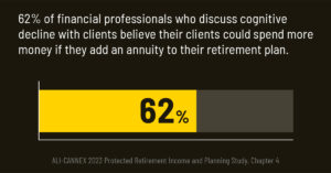 62% of financial professionals who discuss cognitive decline with clients believe their clients could spend more money if they add an annuity to their retirement plan.