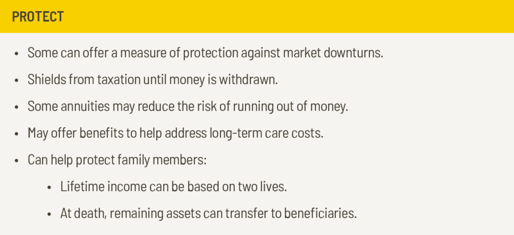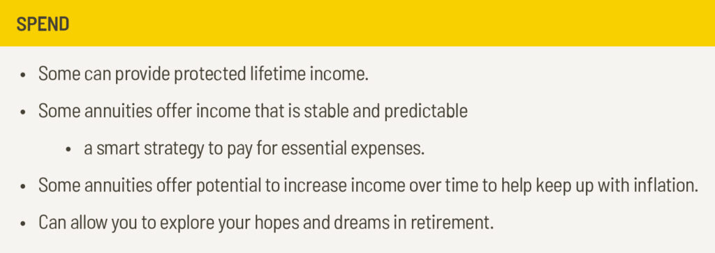 Is your portfolio overweighted to investments that carry more risk? Rebalancing your portfolio and looking for ways to appropriately protect what you’ve amassed makes sense. Keep in mind, when you enter the spend phase you might not have a salary to cover living expenses. While growth is still important, it’s also important to look for products that can provide protection for your money and future income.